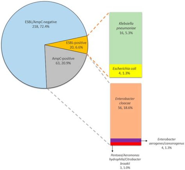 ESBLs can be grouped into three main types: TEM, SHV or CTX-M. Another class of β-lactamases, the AmpC β-lactamases, confer resistance to third-generation cephalosporins and cephamycins (eg, cefoxitin).